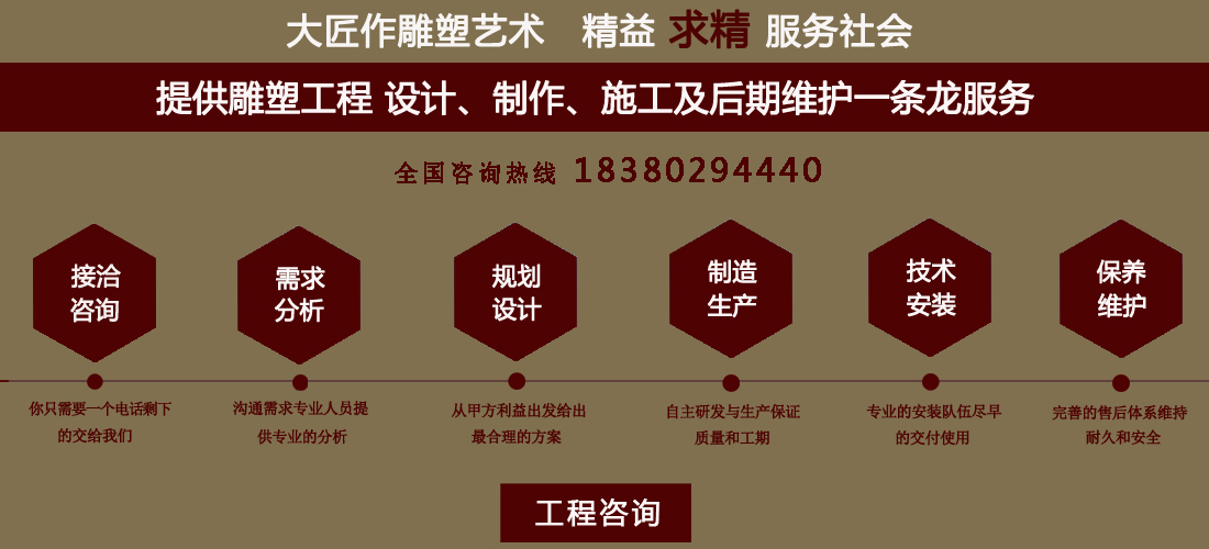 成都大匠作雕塑有限公司,是經(jīng)成都工商局審定注冊的正規(guī)專業(yè)雕塑制作及工程安裝服務(wù)機構(gòu),是由一群年輕富有朝氣的年輕人創(chuàng)辦,發(fā)軔于四川省成都市龍泉驛區(qū)。它是一家******于創(chuàng)作、制作和銷售為一體的公司。大匠作擁有多年從事公共藝術(shù)的專業(yè)人員和雕塑制作人組成的核心團(tuán)隊,為您提供專業(yè)、具創(chuàng)新的設(shè)計及制作服務(wù)。公司成立以來,秉承“******服務(wù)、誠信為本”的宗旨,以客戶需求為目標(biāo)導(dǎo)向,不斷學(xué)習(xí),進(jìn)取,優(yōu)化和提高服務(wù)質(zhì)量,公司向您******——“您的滿意***是我們的信譽”,我們將以飽滿的熱情和******的服務(wù)贏得您的贊譽和支持。 愛心,細(xì)心,耐心,責(zé)任心是我們的要求,盡心盡職,為您打造出創(chuàng)新、專業(yè)、******的設(shè)計方案,我們堅信先做人、后做事,用心對待客戶,實行透明收費,人性化服務(wù),本著對客戶負(fù)責(zé),對客戶負(fù)責(zé),更是對自己發(fā)展負(fù)責(zé)的態(tài)度,爭取做到讓每位客戶滿意